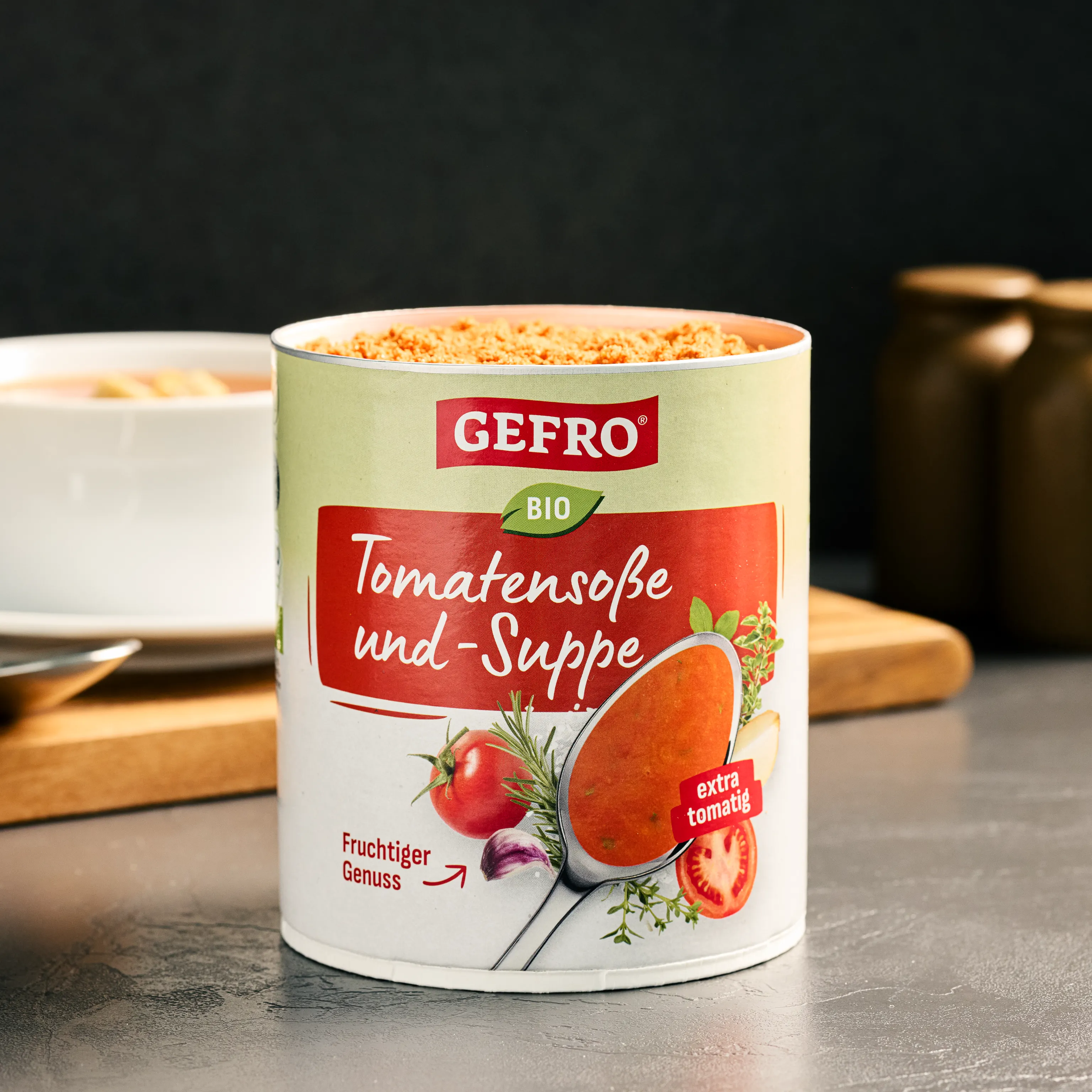 Die GEFRO Bio Tomatensuppe ist eine mediterrane Bio-Suppe auf Basis sonnengereifter Bio-Tomaten. Sie überzeugt mit fruchtigem Geschmack und einer angenehm ausgewogenen Würze. Perfekt für alle, die eine aromatische Tomatensuppe schnell und unkompliziert zubereiten möchten.